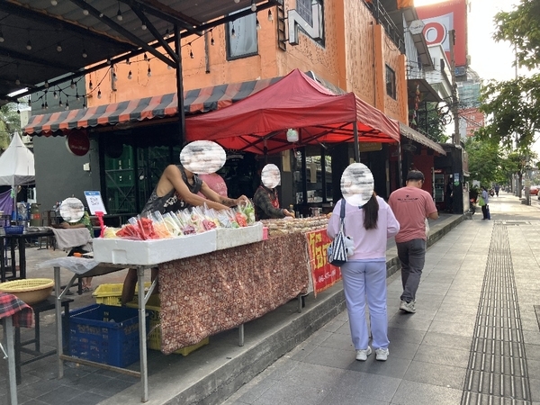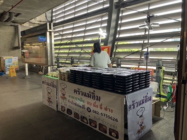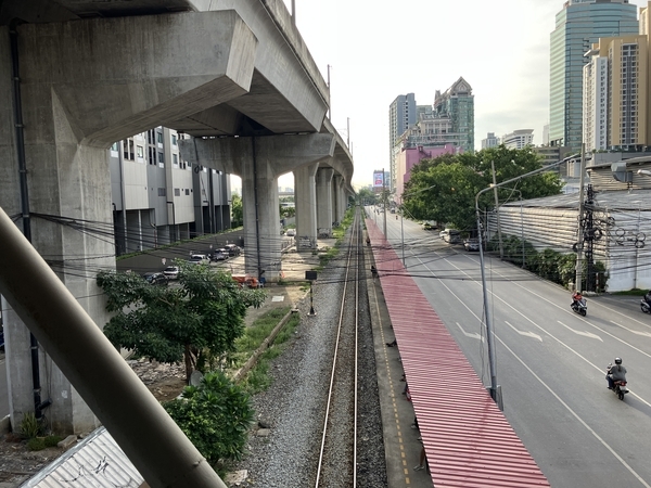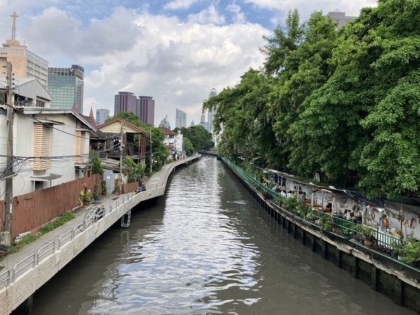 思いのほか歩いた橋のたもとまで来るとお店が出ていて、右側に見える通路にはテーブルが並び観光客も多かったです。調べてみるとどうやらその先のSapan Charoenpol駅で下船しており、予定していたBaan Krua Nua駅は過ぎていました。西へ向かうときは停まらないとか?
