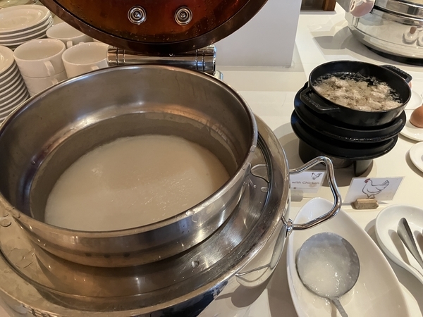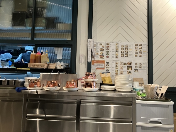私たちが通されたのは、厨房前の通路に面した座席。カウンターには鍋の用意が並んでいます。タイスキ用?