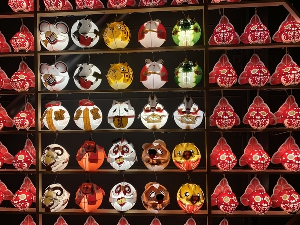 扇型の枠にずらりとキュートな動物のねぷたが並んでいます。