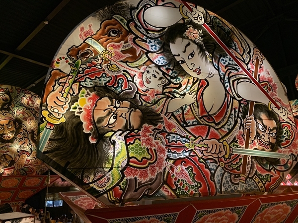 青森ではねぶた、弘前ではねぷたと言いますが、これは単に方言の違いだそう。館内は五所川原の立佞武多館と同じく、ねぷたを中心にスロープを下りてぐるりと見学するようになっています。迫力は圧倒的に五所川原の立佞武多。