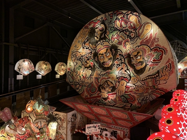 背景に見える大きな扇型はねぷたの裏側で見返り絵といい、唐美人や西王母、楽女のような女性が描かれます。手前の小さなねぷたは江戸時代の古典ねぷた。今では見ることのなくなったねぷたが飾られています。今とは違い四角い箱型で、鳥が飼われているような燈籠もまた品があっていいですね。