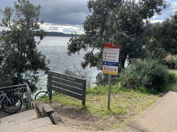 途中、Lady Bay Beachを通りました。なんとここはヌーディストビーチ。階段をずっと下って行くと、岩場と小さな砂浜があるようなのですが、怖いもの見たさに振り返ってみると、確かに!若くは決してないと思しき男性の姿が眼下に少し見えました(笑
