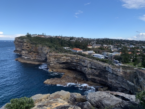 この岩場に座って、向こうを眺めている人もたくさんいました。日差しの強いシドニーでは、冬の8月というのは散策には絶好の時期。たいていは長袖シャツを着ていればよく、曇ったり風が強いときにはポケッタブルのダウンジャケットがあれば調節できて、ちょうどいい感じでした。