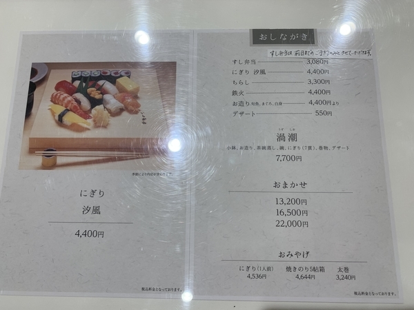 にぎり汐風4,400円を選択。平日なら2,200円のランチにぎり浜風もあります。お手ごろなお店と思いきや、ディナータイムの価格帯からすると、思ったよりも高級店なのかも。