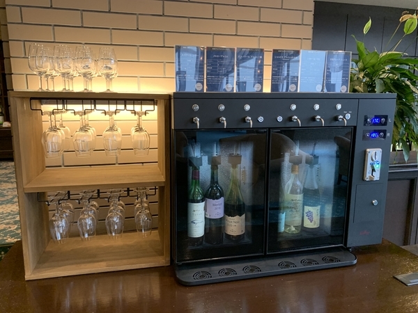 ラウンジの脇にはワインコーナーがあり、フロントで500円玉をコインに交換してもらって、ワインを楽しむことができます。