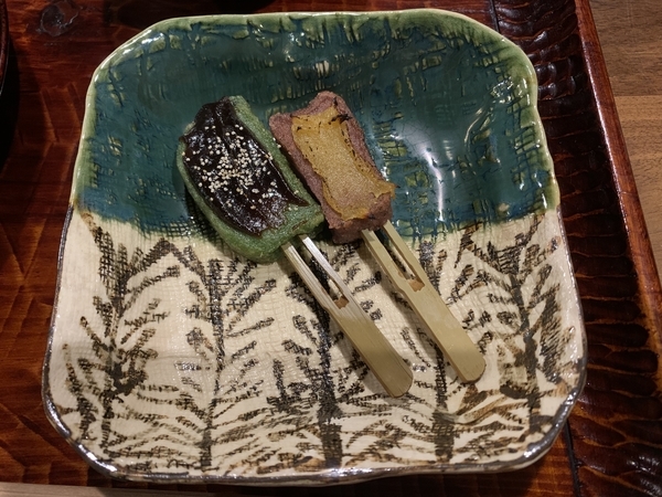 アツアツの生麩田楽は生麩が2種類ならお味噌も2種類。織部のお皿も感じがいい。