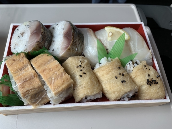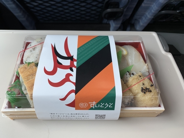 百貨店で調達したのは、九州から出店していた博多すいとうとの鯖の棒寿司やアナゴの押し寿司などが入った寿司弁当。稲荷寿司は詰めるんじゃなくて巻くのね。