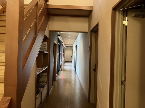 温泉棟への廊下は、今回の部屋の下の廊下をまっすぐ行きます。