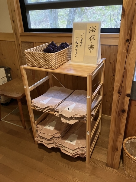 なごみ野の好きな点は、作務衣タイプの部屋着以外に浴衣と帯も置いてあるところ。湯上りに綿素材は助かります。さっと浴衣を着て次のお風呂へ行くときに便利。