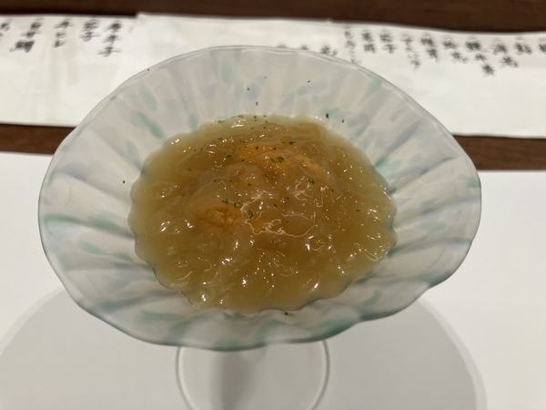 いつもならデザートのシャーベットを盛りつける涼しげな器が始まり。伊勢海老の味がしっかりとのった煮凝りに、たっぷり贅沢の雲丹を絡めながらいただきます。なんとも贅沢な一品。夏らしい食感が嬉しい。