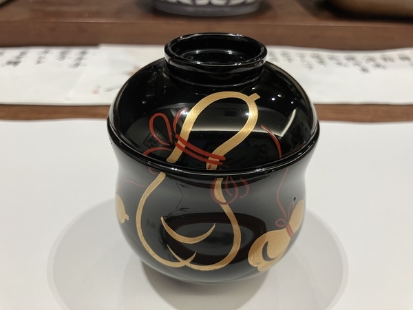 瓢箪のかわいらしい小さな塗りのお椀はお汁粉、しかも甘くないとおっしゃる。