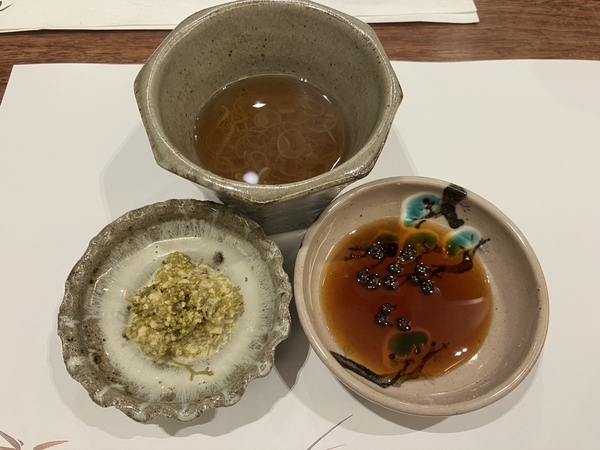 蛤の佃煮にネギを挟んだものでお出汁でいただきます。切り口を撮るべきでした。これでは、なにやらさっぱりわかりませんね。