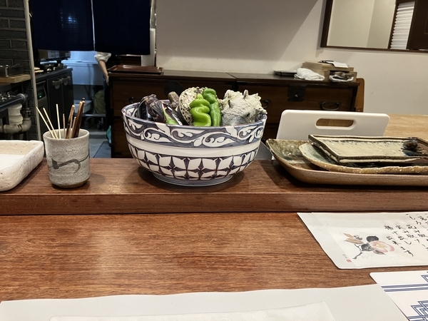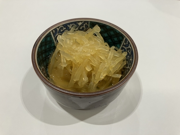 漬けた生姜を刻んで出汁巻きに入れ込んだもの。生姜と卵の相性は抜群だから、こうすると美味しいでしょ?と。なるほど。もっとあれこれ自分の手持ちの保存食をこうして活かせばいいのか。と言ってもすぐ忘れるので、こうしてプロの味をただ楽しんでいればいいですよね。