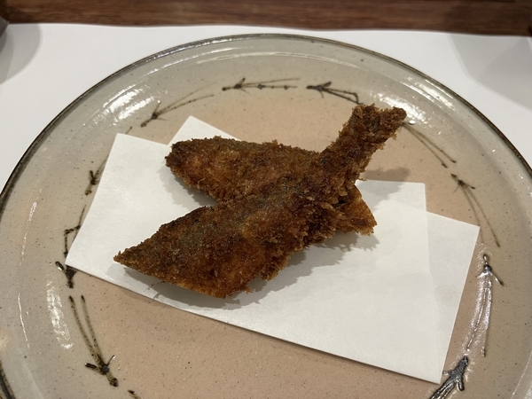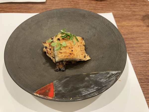 実山椒かタルタルがおススメとのこと。そのままでももちろん美味しい。一齧りしてからタレとタルタルも試しました。甘めのタレとの相性もなかなか良かったです。あとの焼き物に出てくる鮎よりも揚げ物の方がおススメと言われたのですが、カリッと揚がった鮎が何だか新鮮な食べ方に感じられました。そういえば、川魚はここのところ塩焼きばかりだったな。ただ、画像通り少し揚げ過ぎ感アリかも。