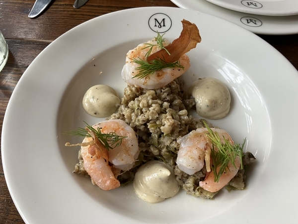 小さい海老だけど、それでもエビが食べたくて選んだ涙ぐましいメニュー。でも、メニューにはGIANT SHRIMPと書かれていたのよ。オートミールみたいな雑穀系をリゾットのように仕上げ、海老にはマヨネーズが添えられているといった料理で、美味しかったんだけどね。