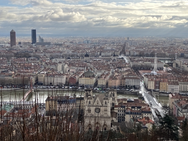 ちょうど外は展望台になっており、見下ろすとリヨン歴史地区と同時に、近代的な高層ビルも見えます。真下の教会はサン・ジャン大聖堂、右手に白い観覧車のある広場がベルクール広場で、これから行くことになります。