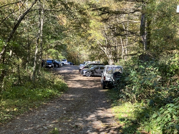 安曇野穂高ビューホテルから1時間半、一ノ沢登山者第1駐車場まで来ました。駐車場はかなり埋まっていますが、手前の第2駐車場に駐車している車がなかったので、空いているほうです。