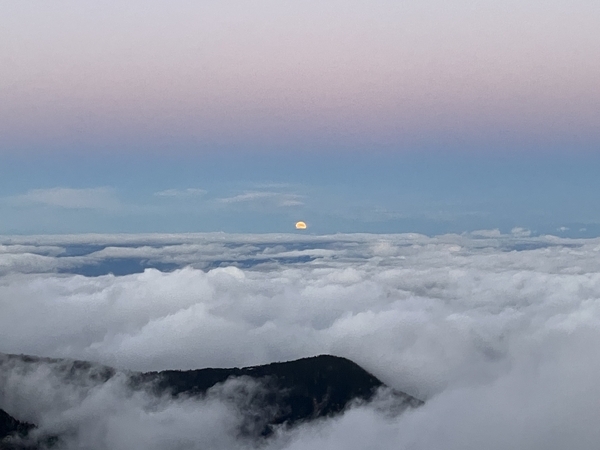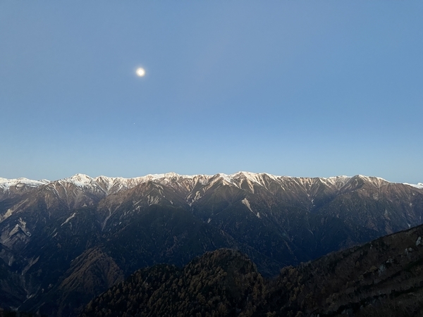 18:30 この日は満月。左下に安曇野方面の街の明かりがわずかに見えています。