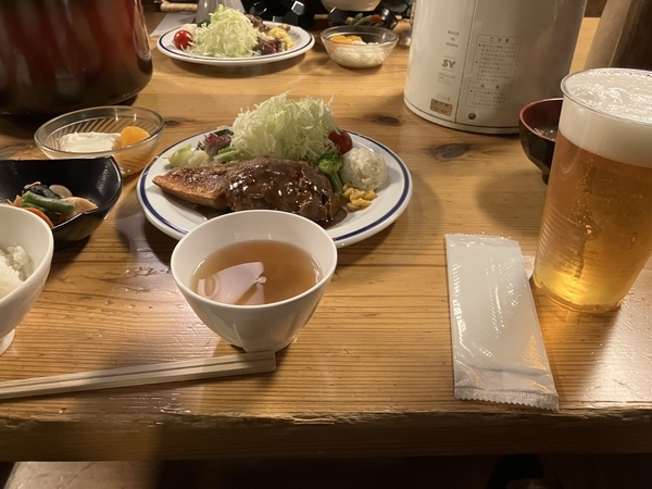 17時半からは食事時間。山小屋の食事ってハンバーグが定番なのかしら。2夜連続です。煮物などもあってかなり充実度が高く、食事もまた評判だというのも頷ける。