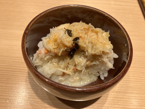 酢飯にオンしたたっぷりのズワイガニ。雲丹のソースと紫蘇の実の佃煮を絡めていただきます。