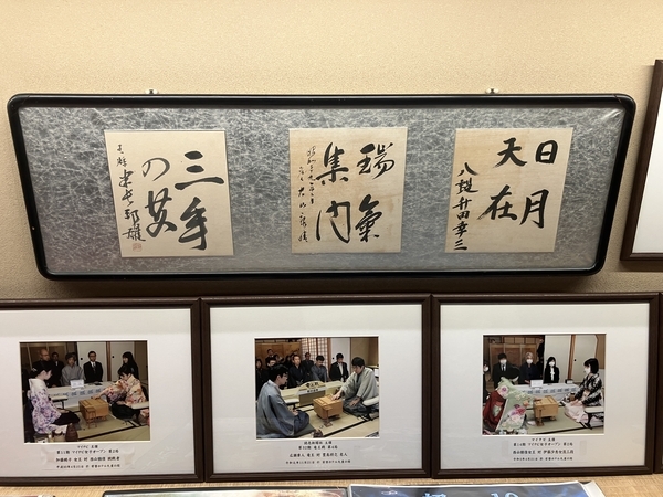 売店側から戻ると棋戦の写真を見つけました。佐々木勇気との竜王戦は、最終局が予定されていましたが、その前に決着してしまったので、残念ながらここでは開催されていません。