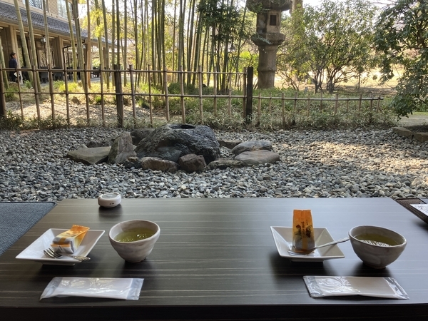 試飲の量ですが、赤白どちらかを選べます。アルコールが飲めない相棒はぶどうジュースのカルピスだったかな。ラウンジ花梨で庭園を眺めながら一息つきます。
