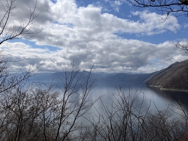 展望台から正面に紋別岳が見えるはずですが、雲の中。透明度の高い支笏湖の雰囲気はわかります。