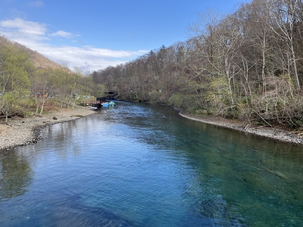 橋上から見える千歳川の始まり。澄んだ水が美しい。