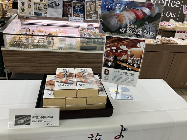 その中にも安宅乃関所寿司(1,480円)や柿の葉寿司(1,200円)、笹寿司(3個420円)、おいなり横丁(700円)の扱いがありました。帰りは売り切れたのか、まだ届いていないのか全種類なかったので、時間によるかと思います。