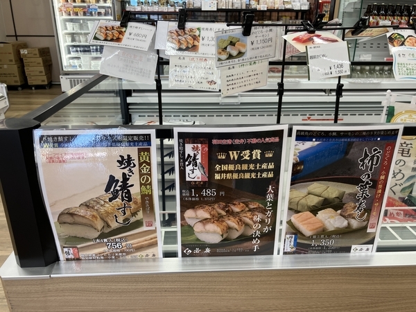 その一角にある駅コンビニでは、焼鯖すし(1,485円・ハーフ756円)、柿の葉寿し(1,350円)、ますのすし本舗 源のますのすし(一重2,000円・小丸1,400円)のほか、北陸新幹線開通を記念して福井の名物料理10品を詰め込んだ竜のめぐみ(1,680円)など、各種取り扱いがありました。