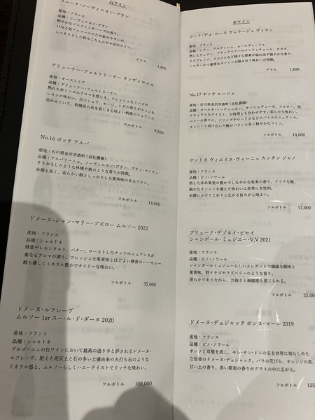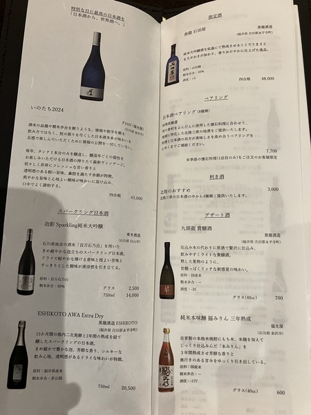 日本酒もスパークリング日本酒14,000円や限定酒48,000円など手が出ません・・・ペアリング7,700円が安いと感じた理由はここにあります。