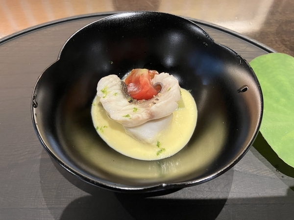鱸と玉蜀黍 加賀太胡瓜 もっちり茄子と書かれています。甘いと玉蜀黍スープが敷いてあり、胡瓜、茄子の他、里芋とフルーツトマトも。茄子が少し油っぽかったので、この先の料理を少し警戒してしまいましたが、ソースを絡めて美味しくいただきました。