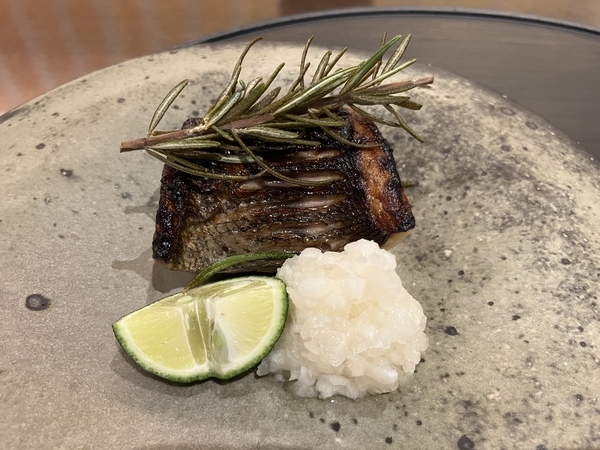 4品目 伊佐木の柚香焼きは柚子につけた伊佐木に大根おろしと酢橘が添えられています。伊佐木は6-7月がこのあたりでの旬。