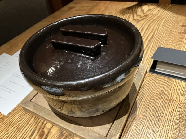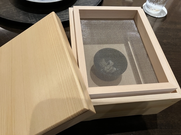 そこへ木桶を持ったスタッフがやって来ました。今回、別注文した鰻寿司のための鰻をお披露目。能登半島地震で被災して以来、2年ぶりに提供される能登うなぎ。へぇ~ まさにこれから捌いてくれるのね。他に2組ほどにも見せていたので、3組でこの1匹だったかもしれません。
