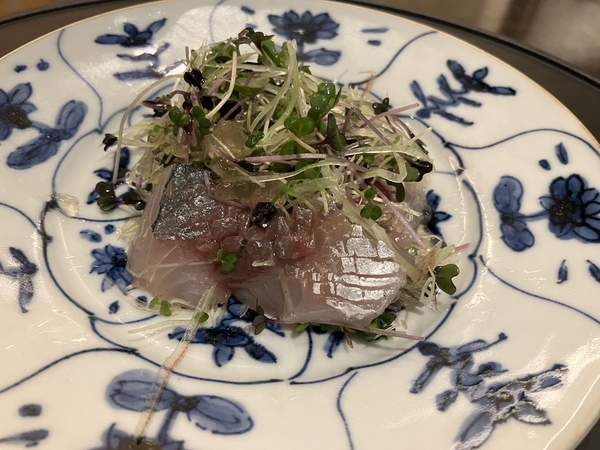 6品目 橋立港 夏鯵は、たっぷりのブロッコリーなどのスプラウトに埋もれています。