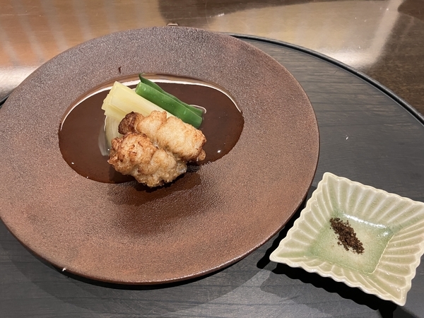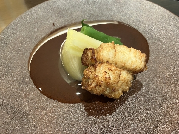 4品目 橋立港 夏かます。メレンゲと海苔をのせて、軽く揚げてあります。ちょっとした工夫が光っているわ。