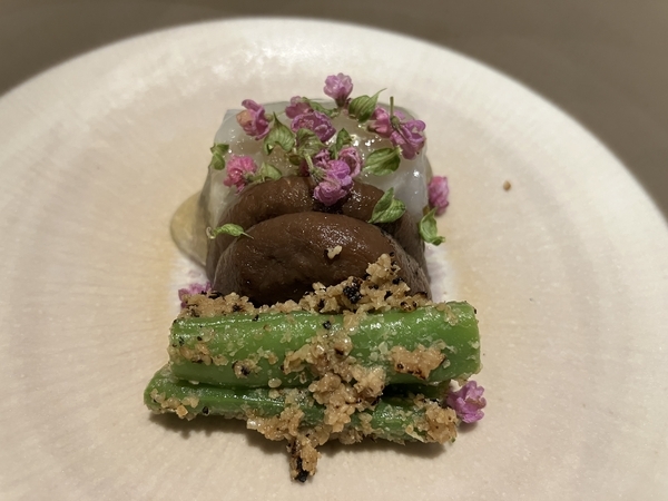 1品目 夏鱚 隠元豆 椎茸。鱚の上には土佐酢ジュレがかかっています。今、ジュレって多いよね。隠元豆は胡麻和えにしていますが、これがスモークされていて美味しかったわ。