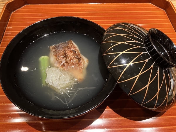 2品目 甘鯛のお椀。松葉をイメージさせる器です。香ばしく焼いた甘鯛と白髪葱、オクラが入っています。とろみがつけてあって、美味しいお出汁。