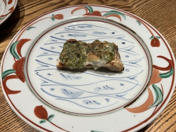 日本酒は手取川 山廃純米吟醸(2,600円)に移ります。でも、火入れ感が強く期待した味ではなかったな。九谷焼のお猪口がさらに続きます。いろんな形があるわ。
