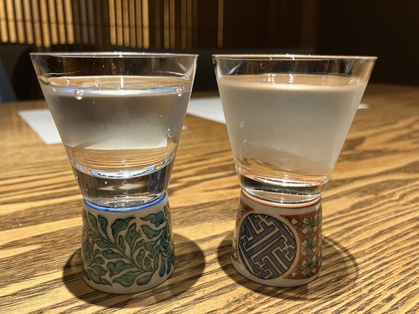 羽根屋の4合瓶登場。ショップにもあった九谷焼の脚がついたグラスでいただきます。華やかで素敵。