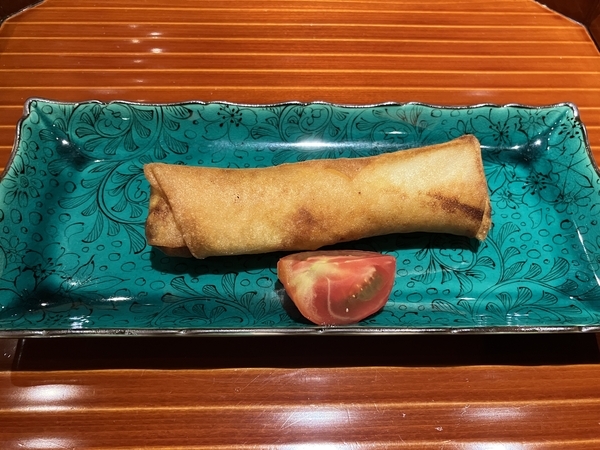 5品目 玉蜀黍と新生姜の春巻き。これは中身も撮ればよかったです。新生姜の味はあまりしなかったのだけど、玉蜀黍がほっくほくで気に入った一品だったな。