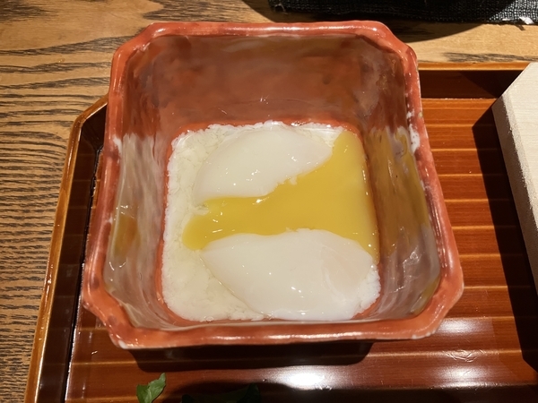 温泉玉子の黄身はふつうよりも黄色い。猪肉と甘辛いお出汁をたっぷり絡めても残るので、さらにお出汁を入れて完食。