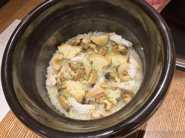 北陸の釜炊きご飯は丁寧に切り込みを入れたバイ貝のごはん。何が残念かというと、3合ぐらいあって、相当大食いでなければ絶対に完食できない量なの。バイ貝をたっぷり使ってあることを見せたいのだろうけど、あとでおにぎりにしてくれるわけでもない量を出すってどう?賄いになるだけじゃん。