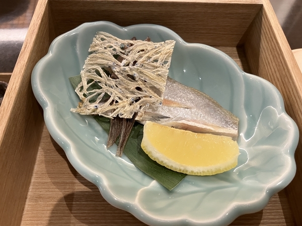 上段には七輪でいただく干物。のどぐろ、ほたるいか、たたみ鰯の3種類で、ほたるいかはさっと炙って縮んだところでいただきます。たたみ鰯が美味しかったな。
